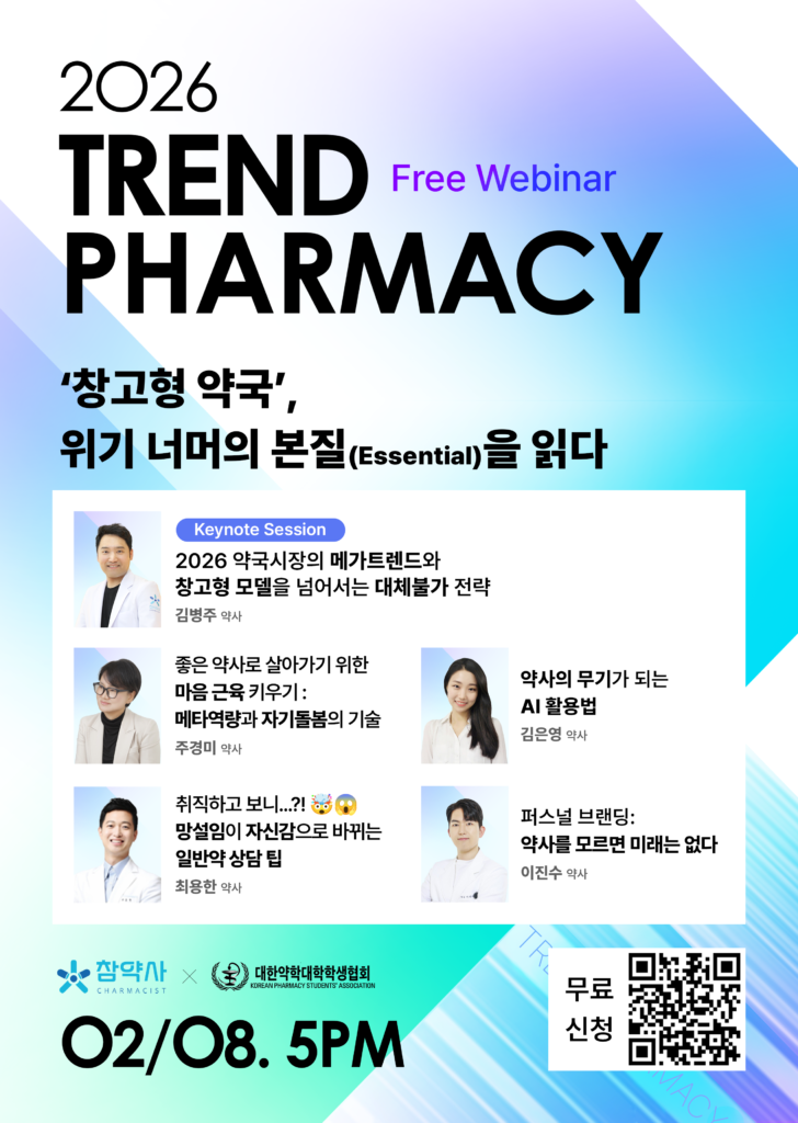 참약사가 되기 위해 노력하는Charm약사 약국 체인 참약사 컨텐츠 TREND PHARMACY 2026 컨텐츠 TREND PHARMACY 2026 2026.01.26 신청하러 가기>>