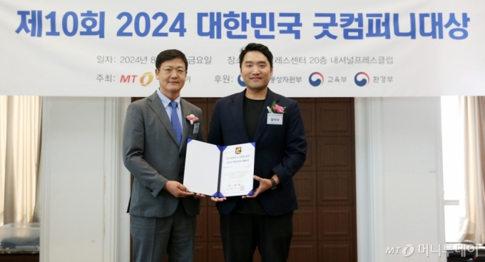 김병주 참약사 대표(사진 오른쪽)가 23일 오후 서울 중구 한국프레스센터에서 열린 머니투데이 주최의 ‘2024 제10회 대한민국 굿컴퍼니대상’ 시상식에서 ‘맞춤형 헬스케어’ 부문 ‘Good-Platform Award'(굿-플랫폼대상)를 수상하고 송기용 머니투데이 전무와 기념사진을 찍고 있다.
